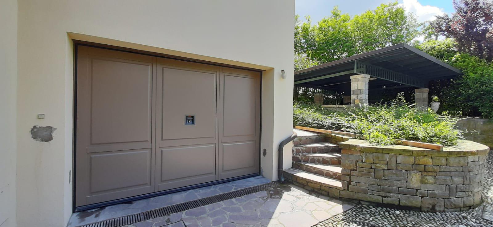 แตกต่างจากประตูโรงรถอื่น ๆ คือเปิดด้านข้าง แทนที่จะเปิดขึ้น และแบ่งออกเป็นวิธีการเลื่อนและพับโดยละเอียด วิธีนี้มักใช้เมื่อเพดานต่ำและยากที่จะติดตั้งโรงรถประเภททั่วไป อย่างไรก็ตามไม่เพียงแต่ด้านบนเท่านั้น แต่ยังรวมถึงด้านล่างของรางที่มีโครงสร้างแทรกอยู่ด้วยและในกรณีของรางล่างการเข้าออกบ่อยครั้งอาจทำให้เกิดความเสียหายและมีสิ่งแปลกปลอมหมักหมม หากไม่มีรางล่างแสดงว่าประตูไม่ได้รับการรองรับอย่างมั่นคงและโครงสร้างไม่มั่นคง